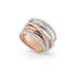 Een 18kt roségouden brede ring gemaakt van acht kruisende draden. Vier draden zijn bezet met een rij briljant geslepen diamanten, 100=0,65ct H SI, zettingen wit gerodineerd. Aan de onderzijde is de scheen dicht. Breedte bovenzijde ca 15,5mm en onderzijde 10,6mm.