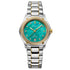 Een ronde 34mm bi-color kast, een bi-color schakelband, een diamanten lunette, een parelmoer wijzerplaat en een quartz uurwerk.