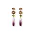 Een paar 18kt geelgouden oorhangers uit de BoHo collectie van Ole Lynggaard van boven naar beneden gezet met 4 verschillende soorten stenen; grijze maansteen, cashmere quarts, groen toermalijn en amethist.