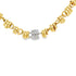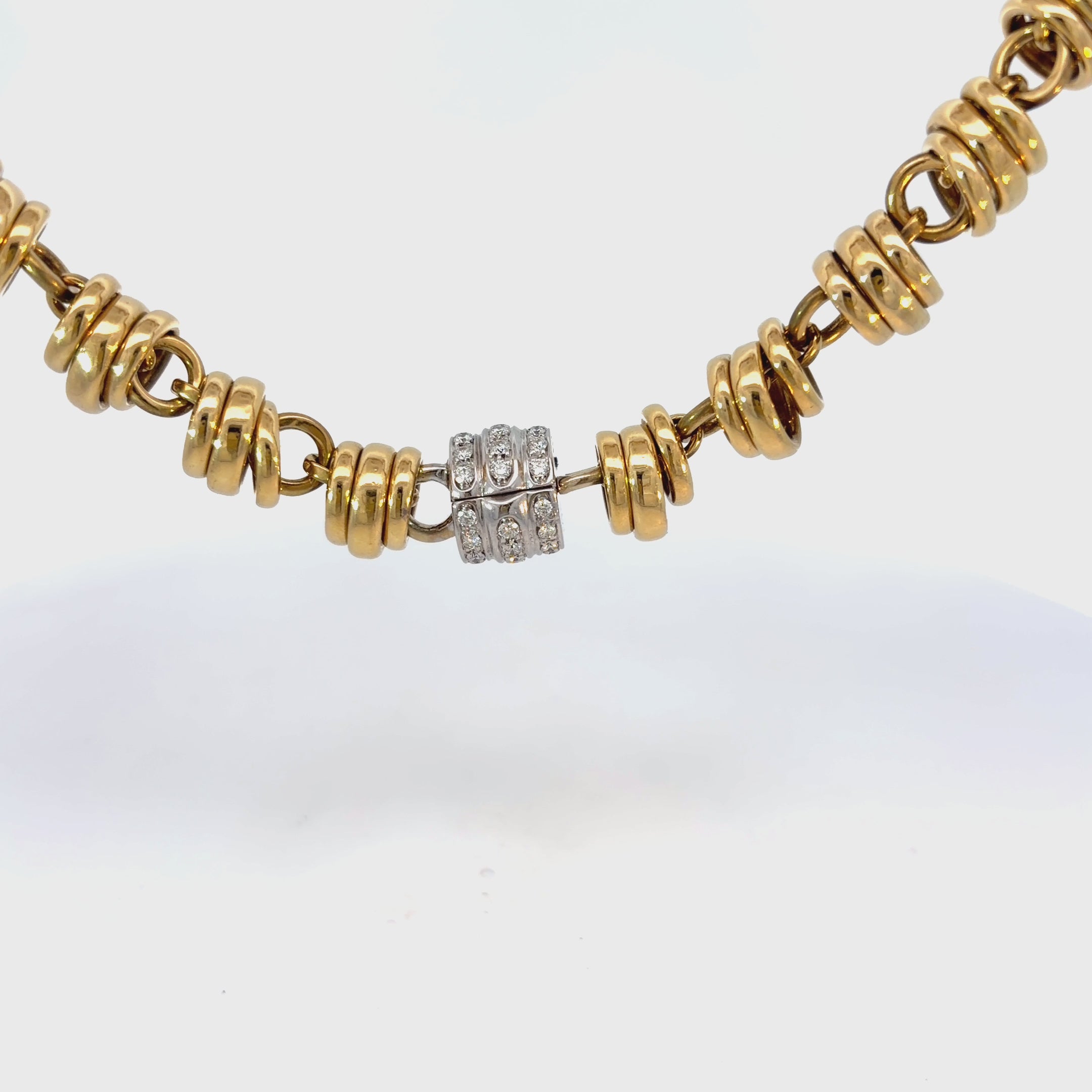 Een 18kt geel met witgouden collier bestaande uit ronde schakels met hieromheen verschillende maten rondellen, de sluiting klapt open en is bezet met 38 briljant geslepen diamanten, samen 0.76ct F/G-VVS, Pre-Owned ca 1980, Marge, 141,2 gram
