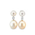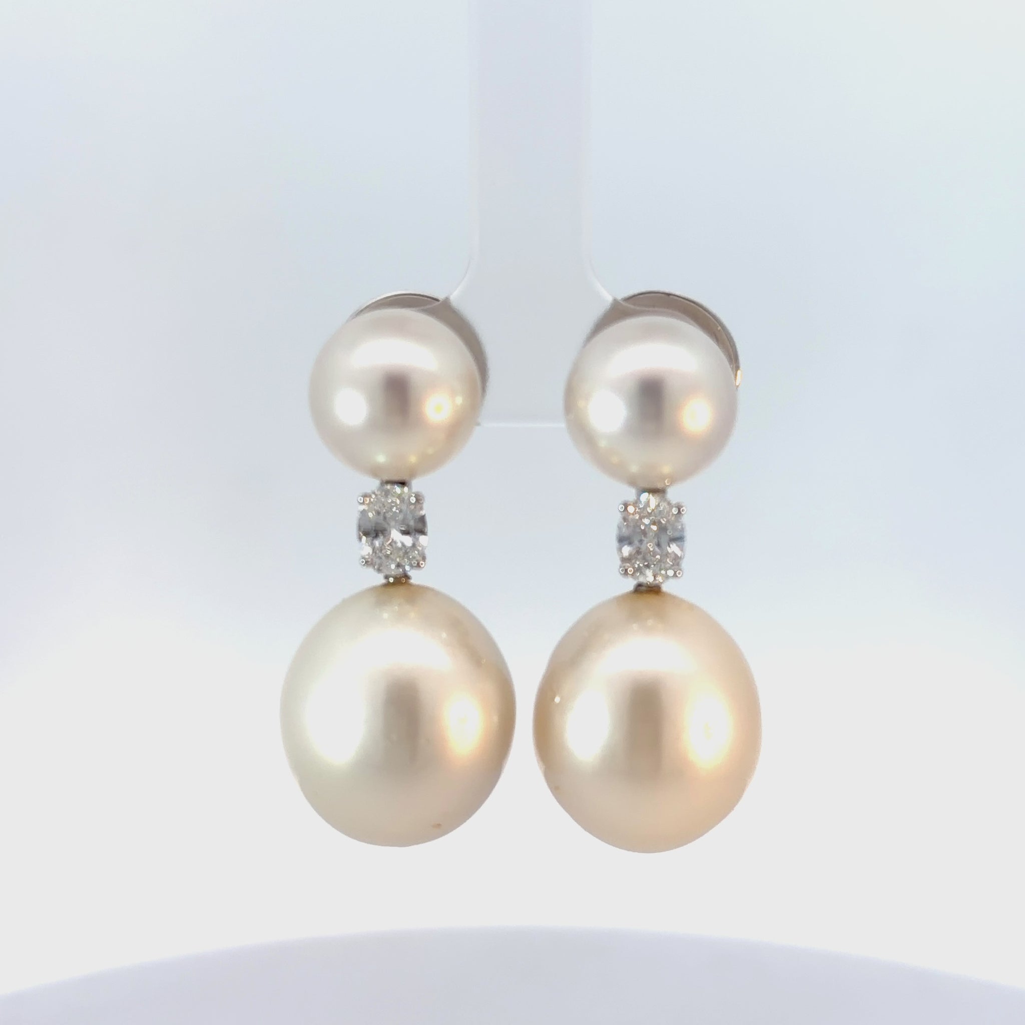 Een paar 18kt witgouden Zuidzee solitair oorstekers afneembaar daaronder een paar ovale diamanten 2= 0.87ct. E-VS en daaronder afneembaar een paar peer Zuidzee druppelvormige parels.