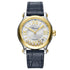 Een ronde 36mm bi-color kast, een alligator lederen band met gesp, zeven Happy Diamonds, een automatisch uurwerk en saffierglazen achterdeksel.
