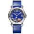 Een ronde 36mm stalen kast, een lederen band met gesp en een automatisch uurwerk.